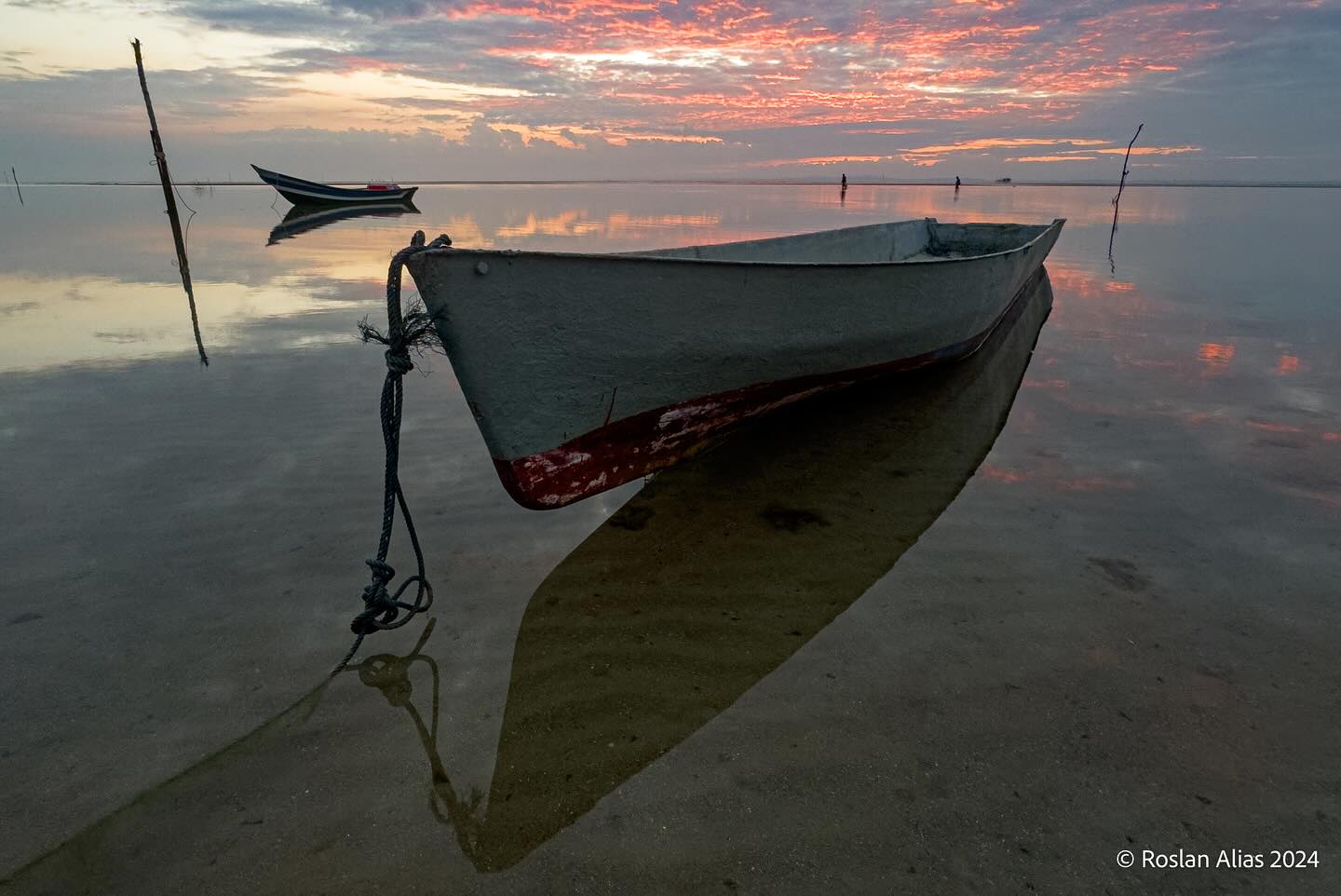 This serene image captures a cluster of fishing boats gently resting on the sandy shore as the sun sets in a blaze of colors, painting the sky with deep oranges, soft pinks, and hints of purple. The silhouettes of the boats, worn yet sturdy, tell stories of hard work and resilience, anchored peacefully against the backdrop of the fading light.